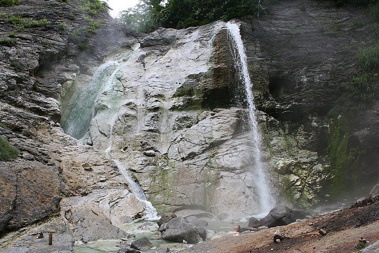 景色に満足しながら遊歩道を歩いていたヘタレだが、坂を下りたところで意外なもんを見て凍りつく。「何じゃこりゃ、駐車場じゃねーか」。そう、実は川原毛温泉はまーまー近くまで道路が通っており、きちんとした駐車場まであるのだ。 「きいてねーよとっつぁ〜ん」と悔しがるが、しゃーないので凹んだまま大湯滝を目指す。大湯滝は駐車場から10分ほど下ったところにあった。 確かになかなかの落差だ。早速海パンを着込み川に入る。と、なんと絶妙な湯加減ではないか。まさに適温。こんな気持ちのいい風景の中でいい湯に浸かれるなんて最高だ。 ちょっと注意したいのがこの温泉は酸性が強く、とっても目にしみること。ヘタレはゴーグルをしていたので大丈夫だったが、知らんとびっくりするので注意でござる。 |